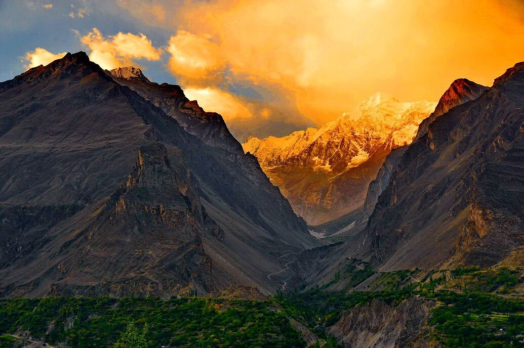 For spectacular sunset views, Eagle's Nest (Duikar) in Hunza Valley, Pakistan, offers breathtaking panoramic vistas of the Karakoram mountains, including Rakaposhi and Ultar Peak, with the Hunza River winding below, making it a famous spot for photographers and nature lovers seeking stunning golden-hour scenery in the Himalayan foothills.